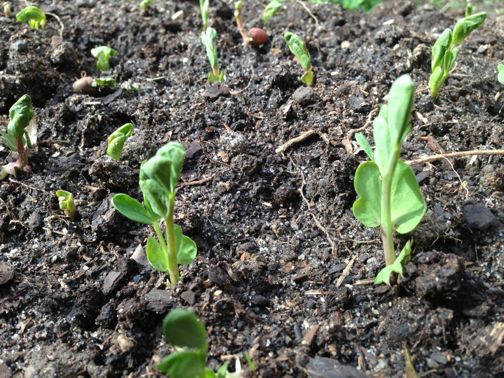 These are 2 week old Snow Pea shoots sprouting on a nice warm patch of soil. I like to start these early to give the plants ample time to become established.