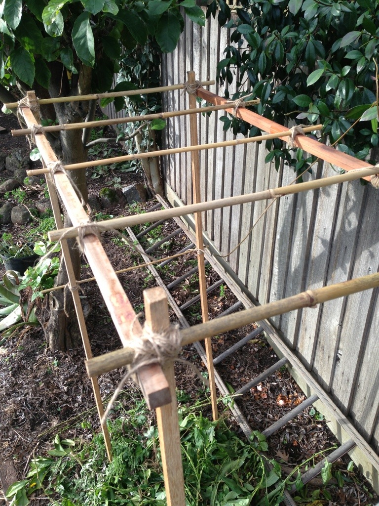 I will be adding more horizontal and diagonal stakes to add additional integrity to the structure, which also serves the purpose of directing any developing tendrils upwards to the top of the frame.