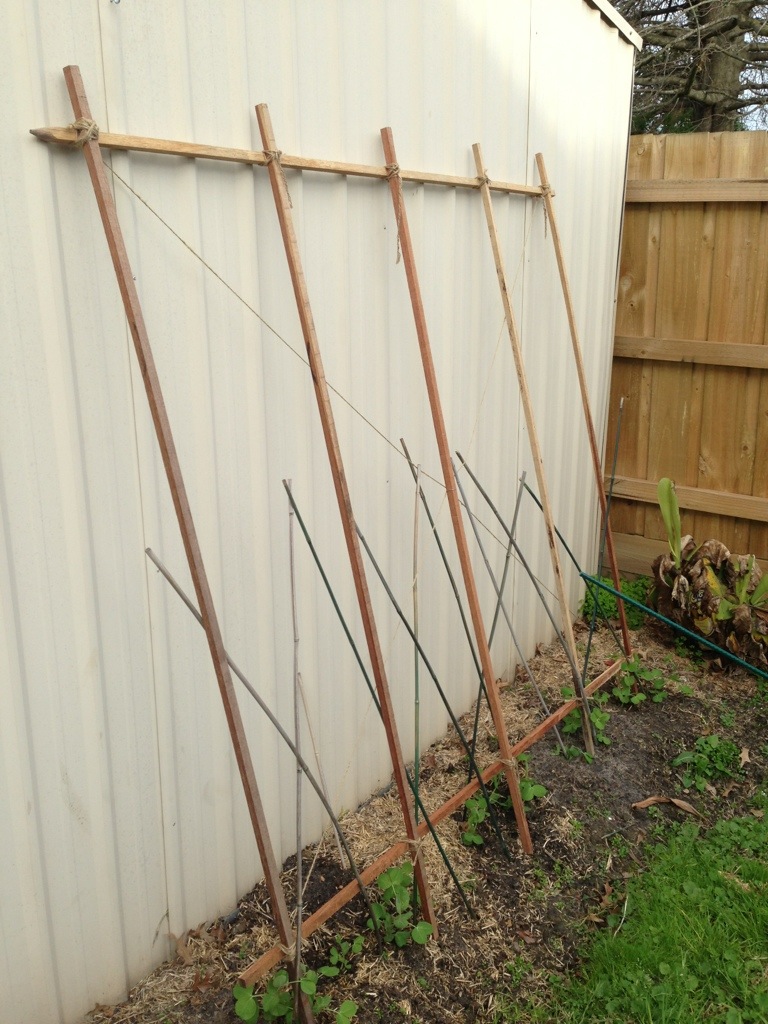 This one below is a very simple frame made from the same timber stakes used above. This frame is a basic ladder and is simply leaning onto our garden shed with the already pointed ends hammered in the ground.