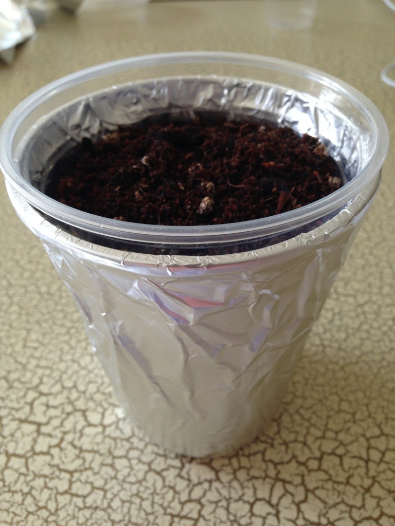 **I wrap the outer ‘sheath’ cup in Aluminium Foil to prevent any algae growing in the moist soil when I place them in the sun. It also helps to regulate the temperature of the soil. It doesn’t matter if it’s shiny side in or out.
