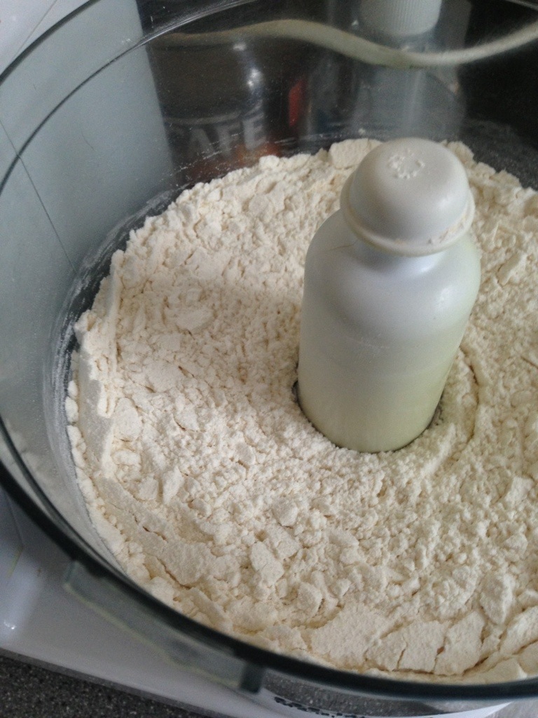 Turn the processor on full speed and blitz the mixture until all the pieces of butter are incorporated into the flour. Don’t forget to cover the chute with either your hand or the cup that it comes with – it will get messy if you don’t.
