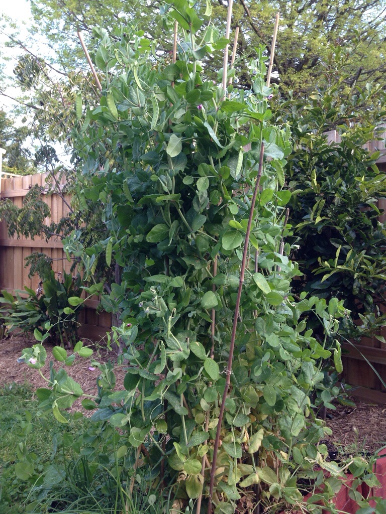 My goal a few months ago was to create a tower of bamboo that was tangled with snow pea vines. When it grew, I imagined I could have fun picking and foraging within for snow peas when the plants started to fruit. This is the result and I am so happy with how it has grown. I have noticed though that the snow peas in this ‘tower’ don’t grow as large as those next to our shed – most likely due to competition for nutrients in this tightly packed space. That they are producing good sized peas is still a triumph, in my opinion.