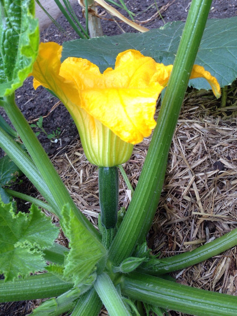 Courgettes grow two types of flowers – both male and female. This flower above is a female. You can tell because of the swollen ovary that is the fruit. Male flowers have a thin stem and are there for pollination only. Although you can see a mini courgette (above), this will not develop into a mature fruit if it is not pollinated by the male flowers with the help of bees. That’s why the flowers are so large and inviting – not just for us to look at and admire, but mainly for the bees to see. The fact that the flower is yellow – one of the bees ‘favourite’ colours, truly shows nature at it’s most cunning best.