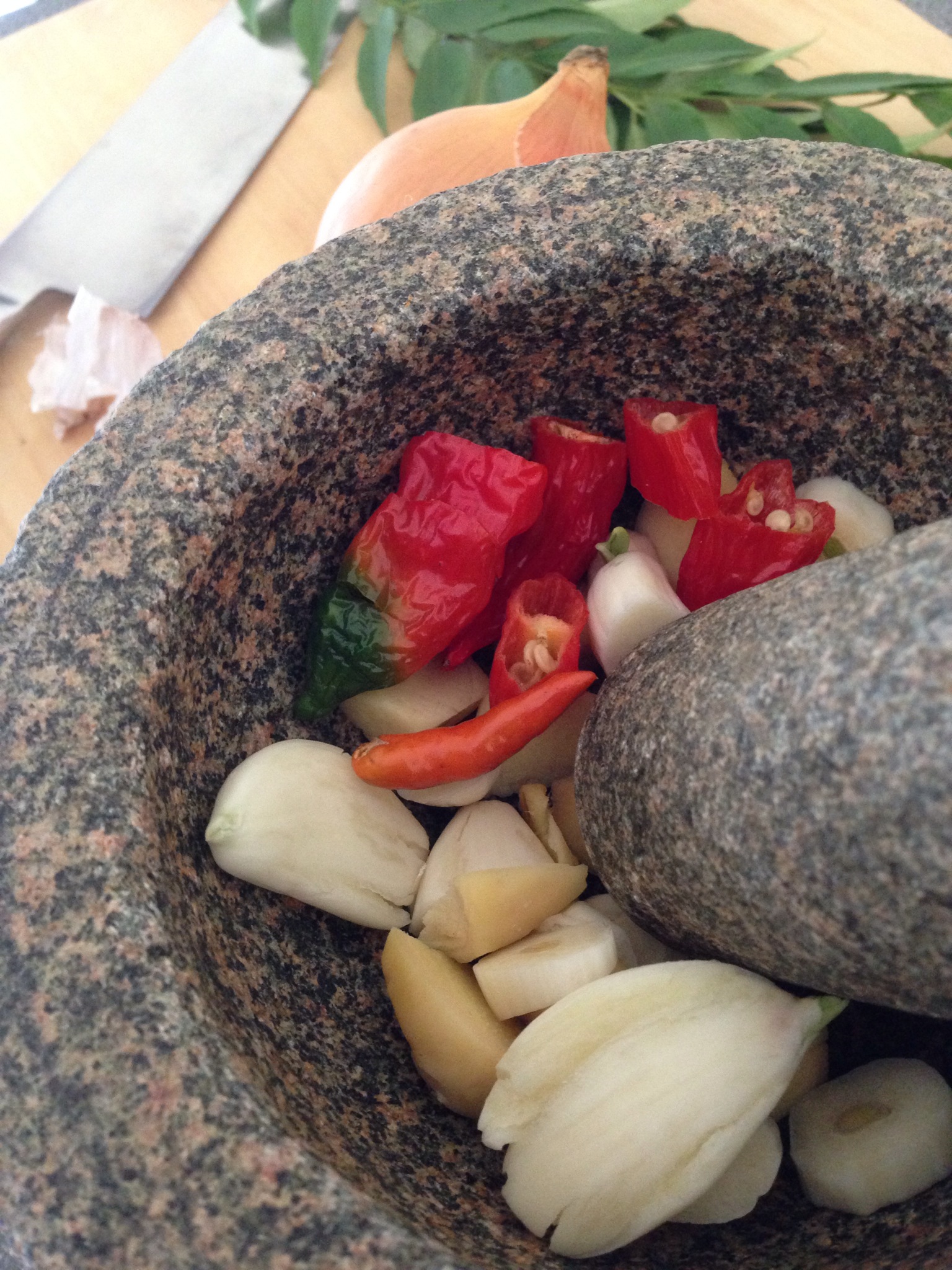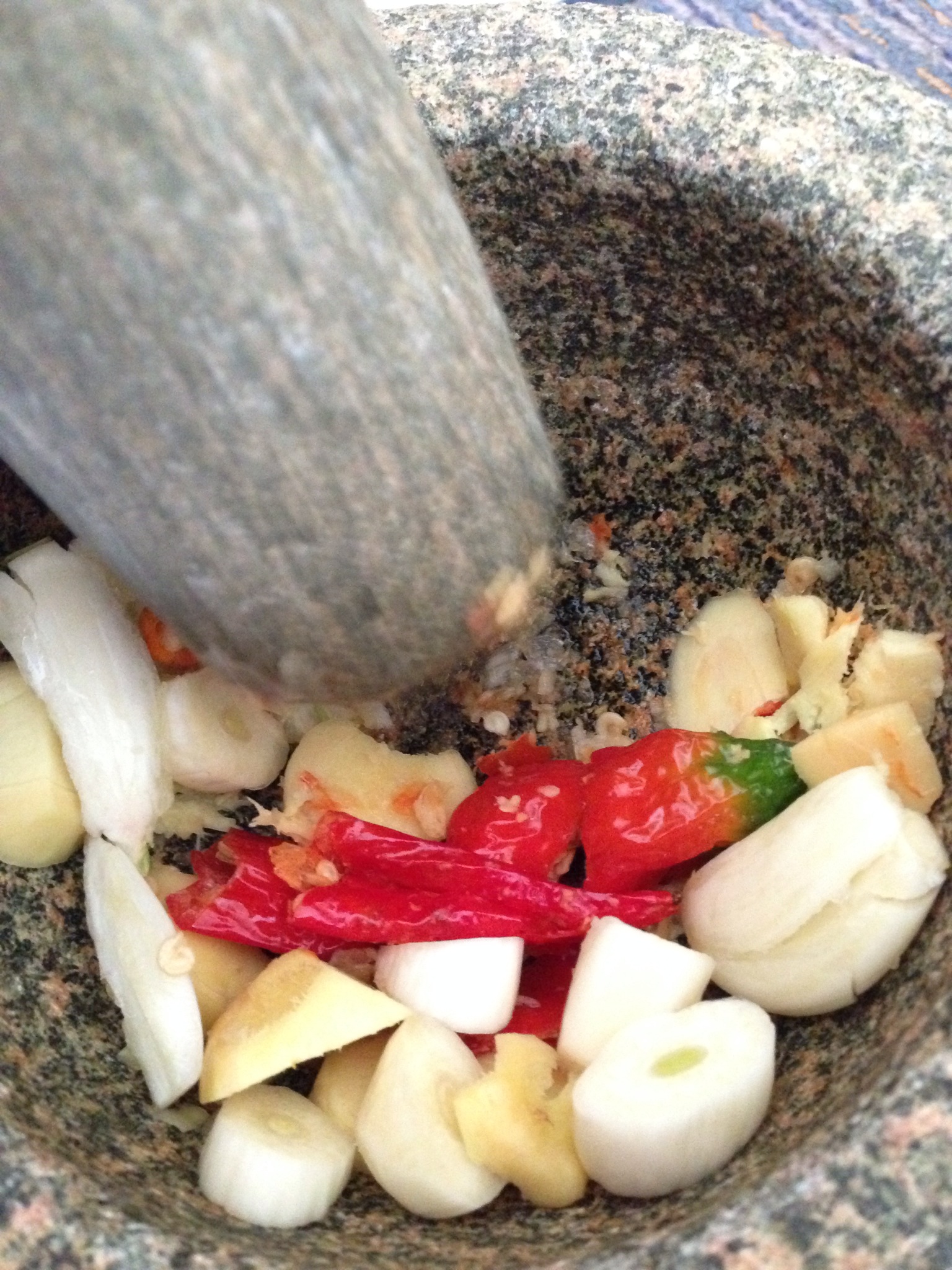 – Next, add all the fresh spices (chilli, ginger & garlic) to a mortar and pound away. I always cut them up to smaller pieces to speed up the pounding process. I don’t pound the onion because it is simply too watery and gets very messy.