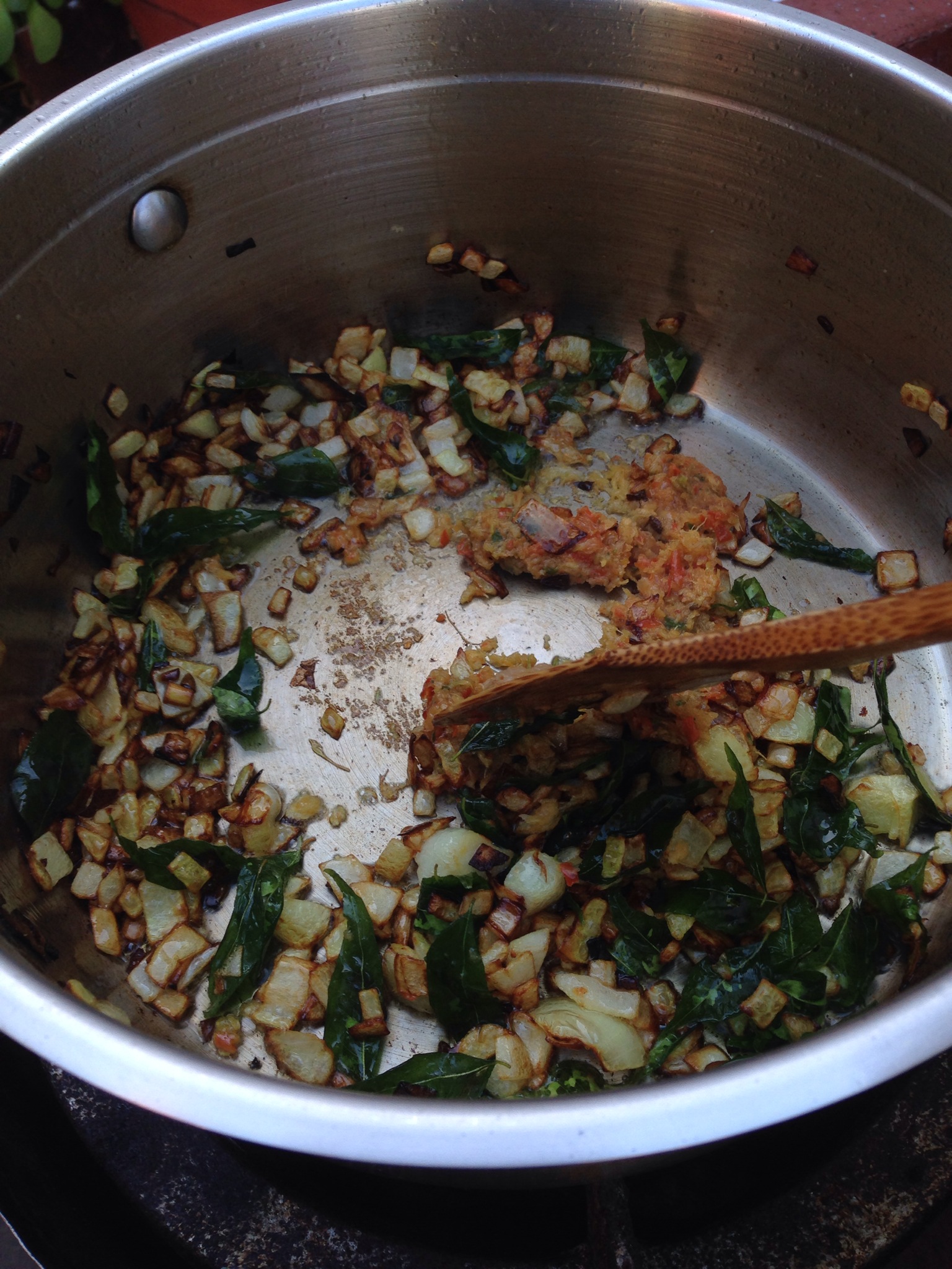 – Next, add the curry leaves and fry them until they become translucent. Be warned though – they will pop and splatter as they sizzle in the hot oil.