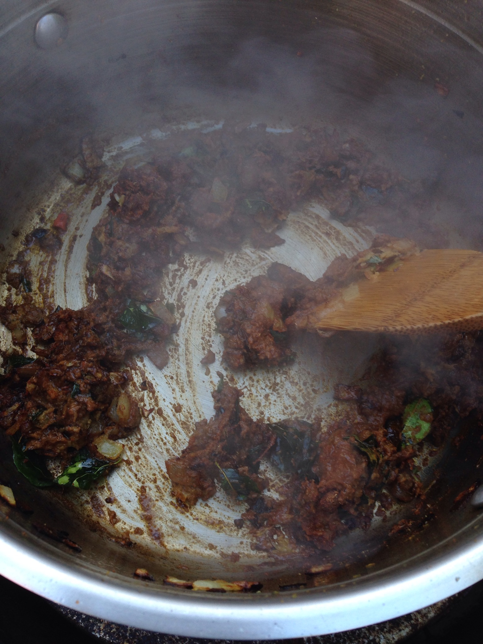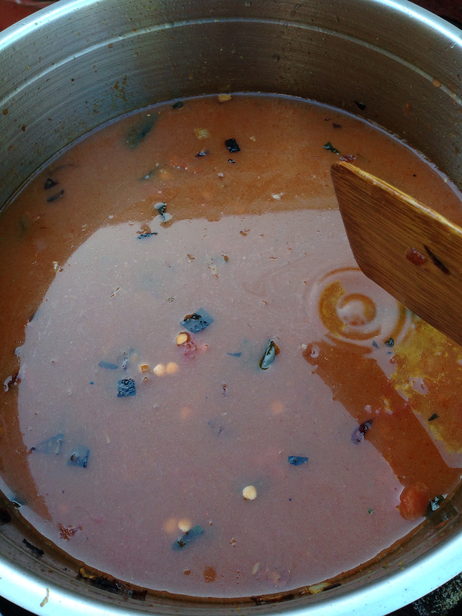 – Stir the tomatoes evenly through and add the soaked lentils, soaking water as well as the water you added to the mortar. At this point there should be enough water in the pot to cover the lentils to the point you can’t see them past the surface. If that isn’t the case then add more water until they disappear below the turbid, spicey, ‘stock’. Don’t be scared by the fact that there is a lot of water – most of it will evaporate or be soaked up by the lentils. Bring the curry to a rapid boil with the lid ajar to allow steam to escape. Stir the bottom every now and then to prevent sticking.