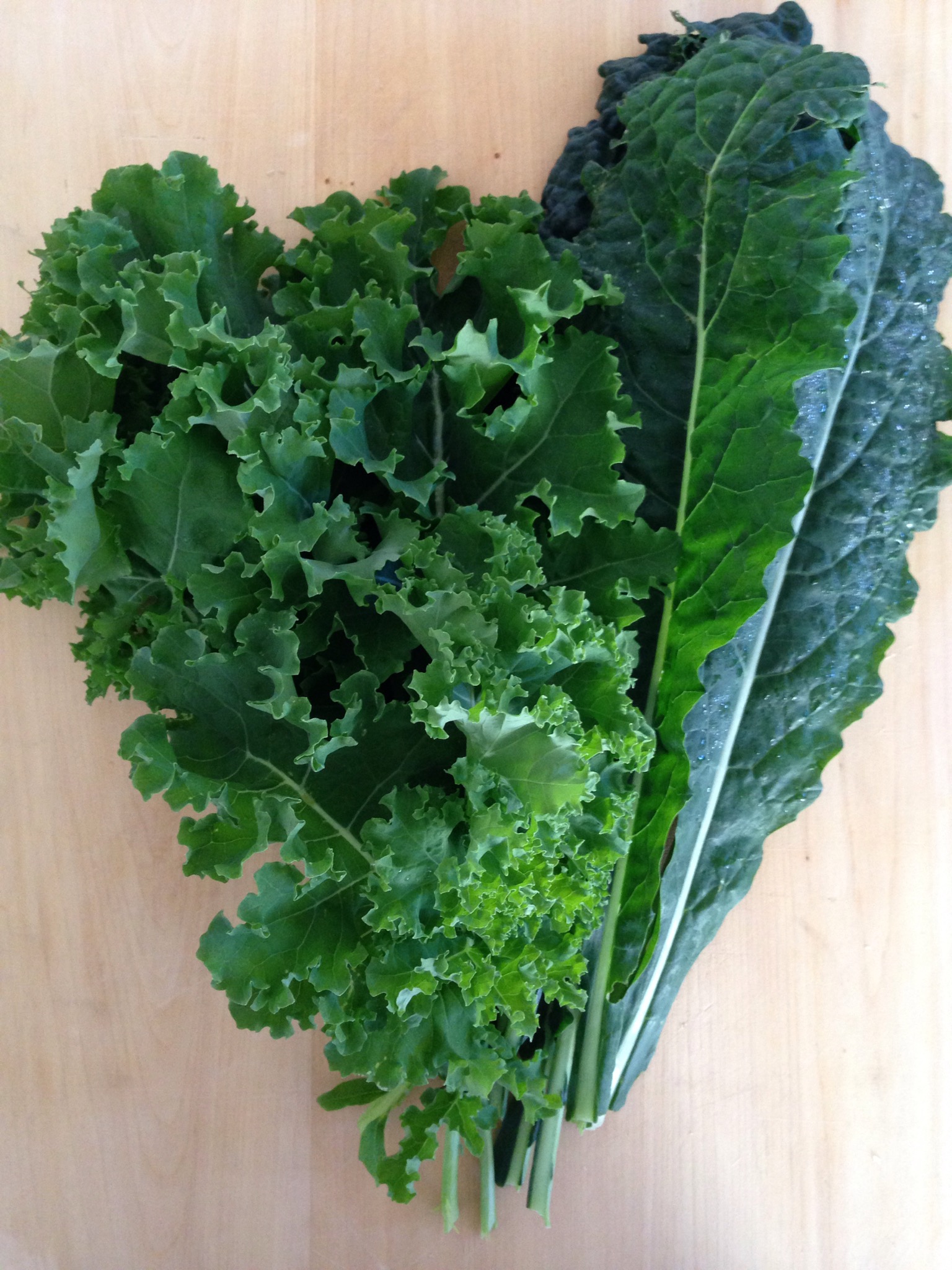 This is the first harvest of kale from our garden this year. To the left is a variety called ‘Drawf Blue’ and to the right is ‘Black Toscana’. I didn’t take many leaves off the parent plants because I want them to keep growing strong – and Spring has only really just begun.