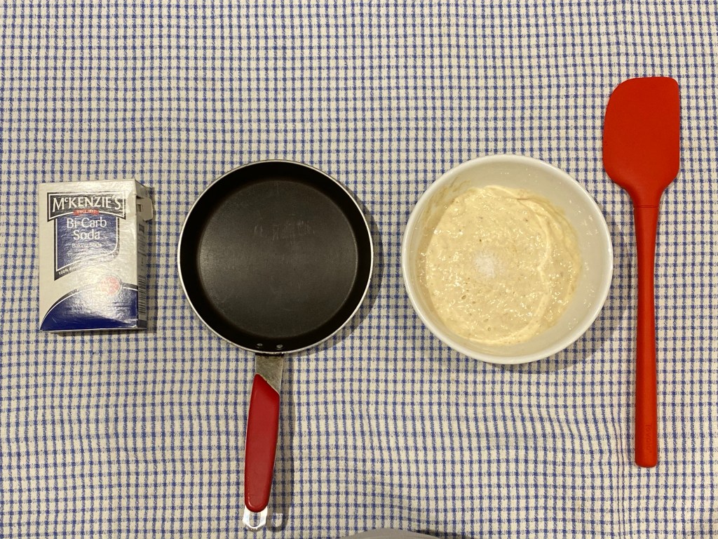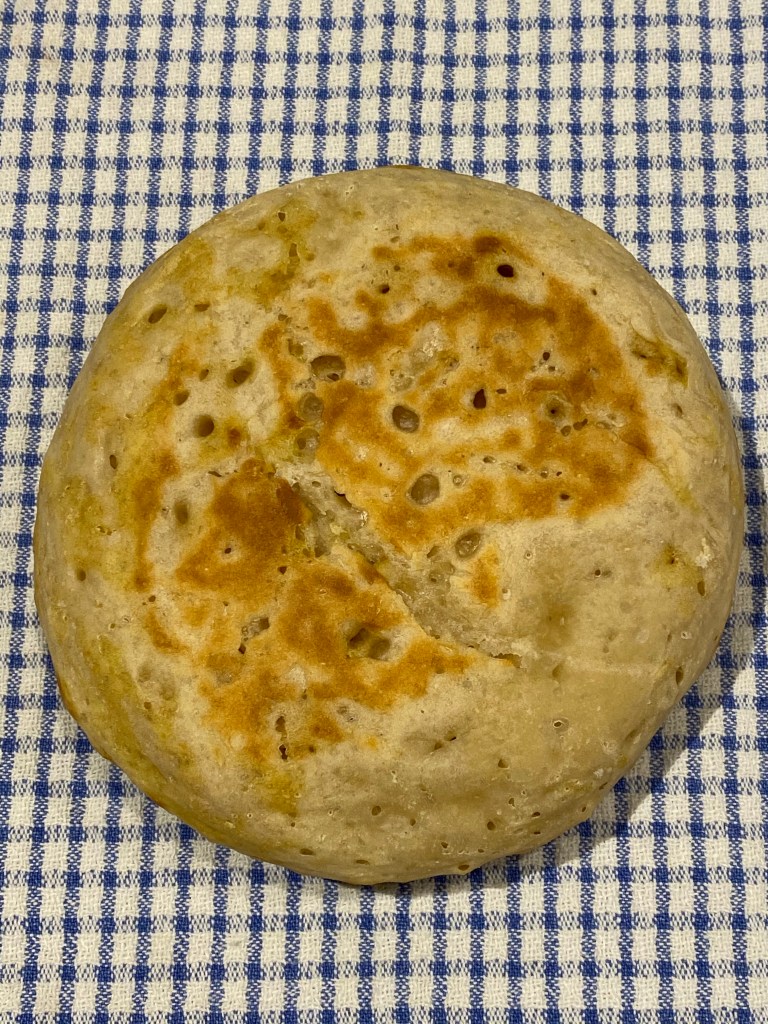 The pan bread will start to form bubbles at the surface, much like a crumpet. It’s almost ready to be flipped when the holes in the centre stay open. This means the mix has cooked through and is no longer gloopy.