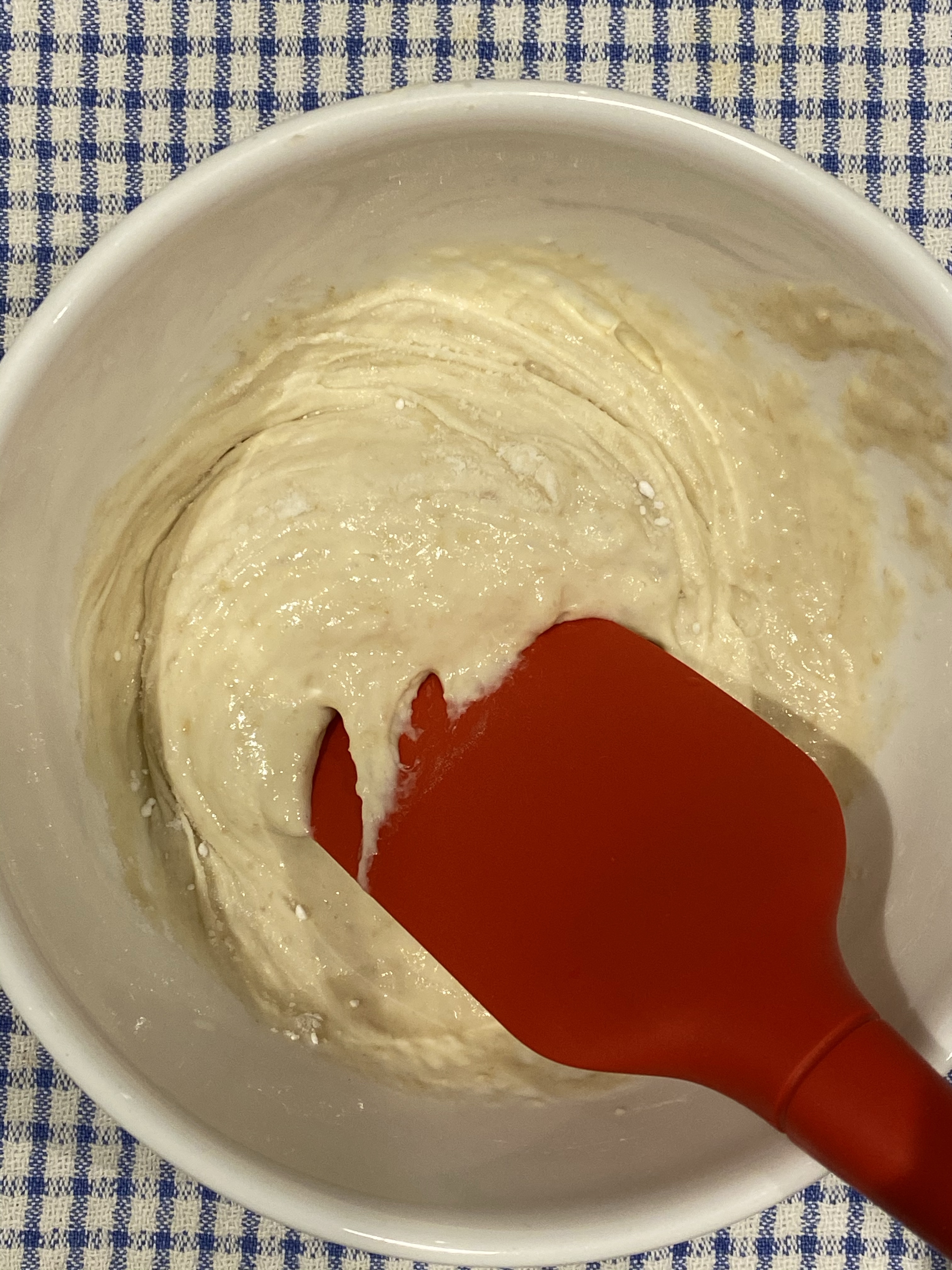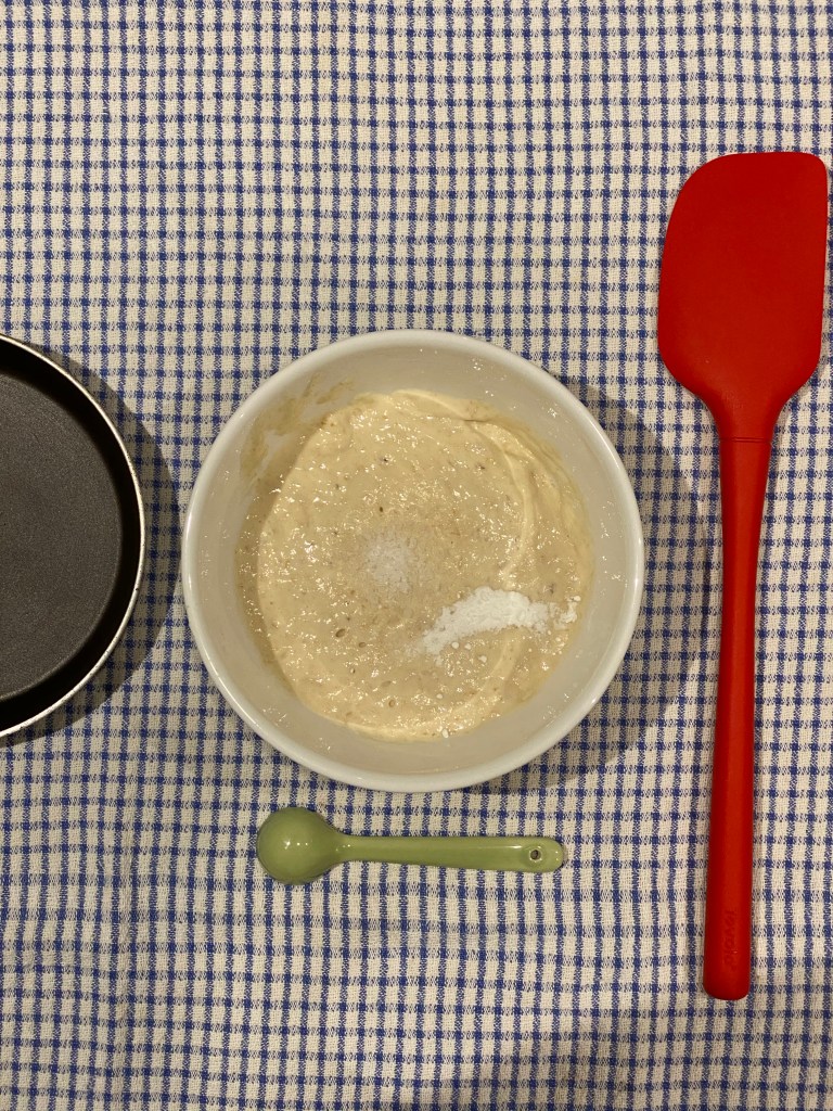 It’s so easy – you literally add the salt and bi-carb soda to the sourdough mixture. The salt adds flavour, which the starter lacks. The bi-carb soda reacts with the acidity in the sourdough to give you instant rise. Mix this up well with a spatula. You can also beat it with the spatula at a good speed to develop some of the gluten.