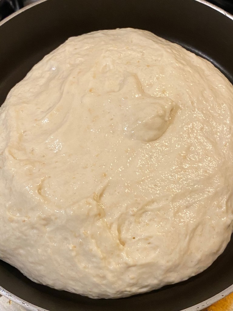 You’ll start to see the pan bread rise and get all bubbly underneath the gleaming, glossy surface.
