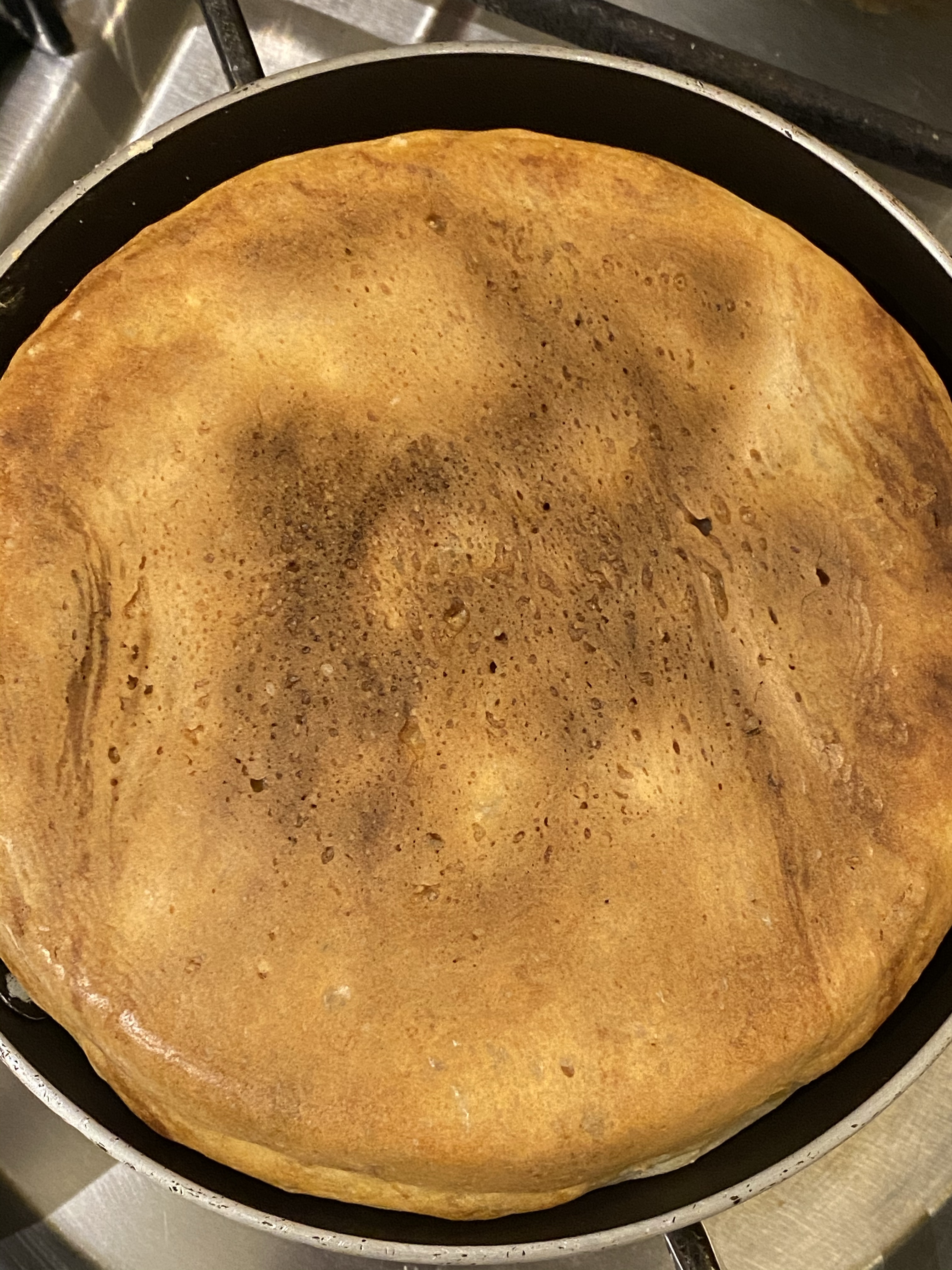 It’s now ready to be flipped. As you can see, the bottom has taken on a lovely dark, crusty appearance. When you run your fingernail over the top, you get a rough, raspy sound. It’s very crispy at this stage.